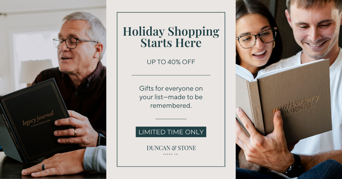 Duncan & Stone Paper Co. is a stationery company that combines timeless design with effortless journaling. Our mission is to connect generations by preserving the life experiences of each person through simple, guided prompts. In a world that chases the momentary, we believe in capturing the moments that matter most through the beauty of handwritten story telling.